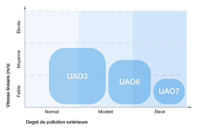 La dureté du moyeu rotatif va dépendre de la vitesse linéaire (en m/s) et du niveau de pollution.